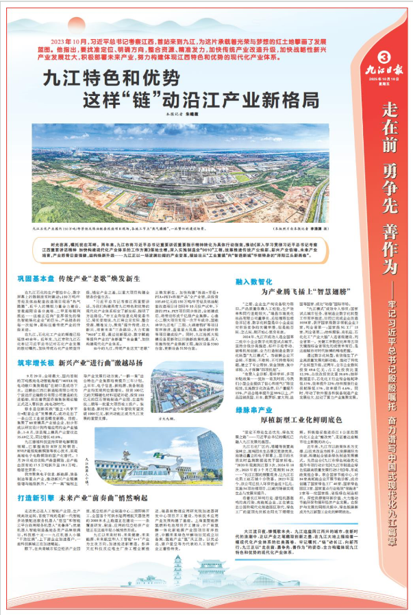 大江流日夜,慷慨歌未央。九江这座因江而兴的城市,在新时代的浪潮中,正以产业之笔蘸取创新之墨,在九江大地上描绘着一幅现代化产业体系的壮美画卷。牢记嘱托,“链”动长江,向新而行,九江正以“走在前、勇争先、善作为”的姿态,全力构建体现九江特色和优势的现代化产业体系。