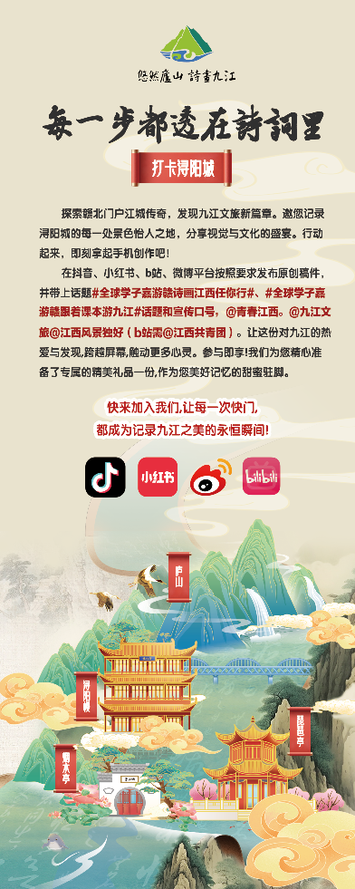 2024年12月,九江市文广旅局联合同程旅行共同打造“跟着诗词游九江”创新玩法,推出“每一步都透在诗词里 打卡浔阳城”活动,为游客免费派发【诗画九江】透卡,让更多人解锁诗画九江。精彩活动提前剧透!