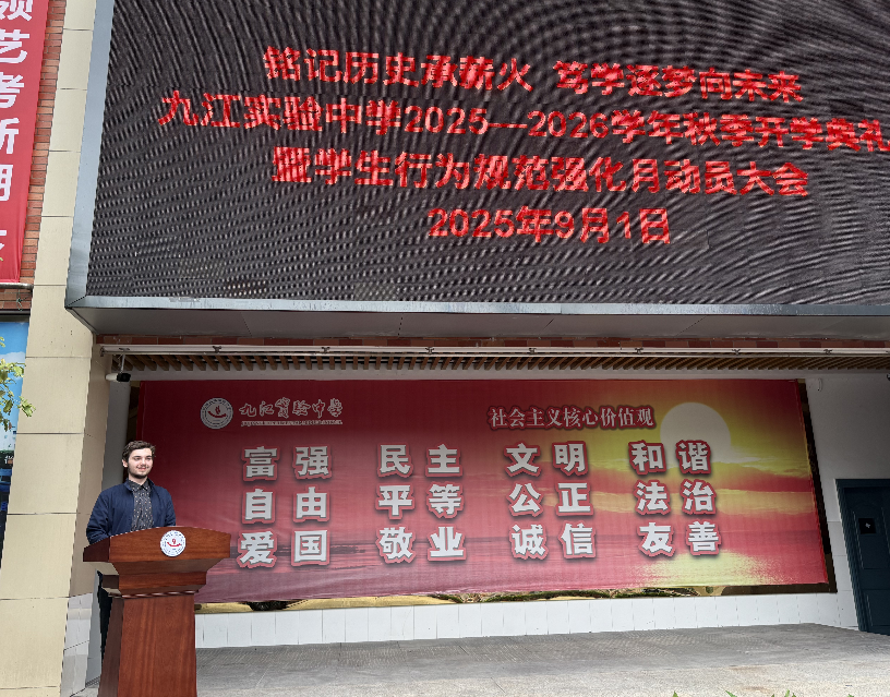 9月1日上午,九江实验中学举行新学期开学典礼。与往年不同的是,今年的典礼迎来了一位特殊嘉宾——来自英国的波兰籍外教Oliver Jasiurski。他的到来,为校园注入了别样的国际元素,也为师生们开启了新学期的“跨文化第一课”。