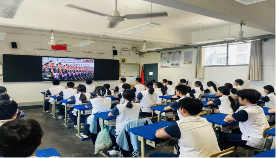 活动当天,校园内充满了庄严的气氛。在各班教室内,学生们坐姿端正,目光聚焦于屏幕。随着阅兵仪式的启动,护旗方队以坚定的步伐穿越广场,抗战老兵方阵以敬礼表达敬意,以及各式现代化装备构成的钢铁洪流依次展现,教室内不时爆发出热烈的掌声。