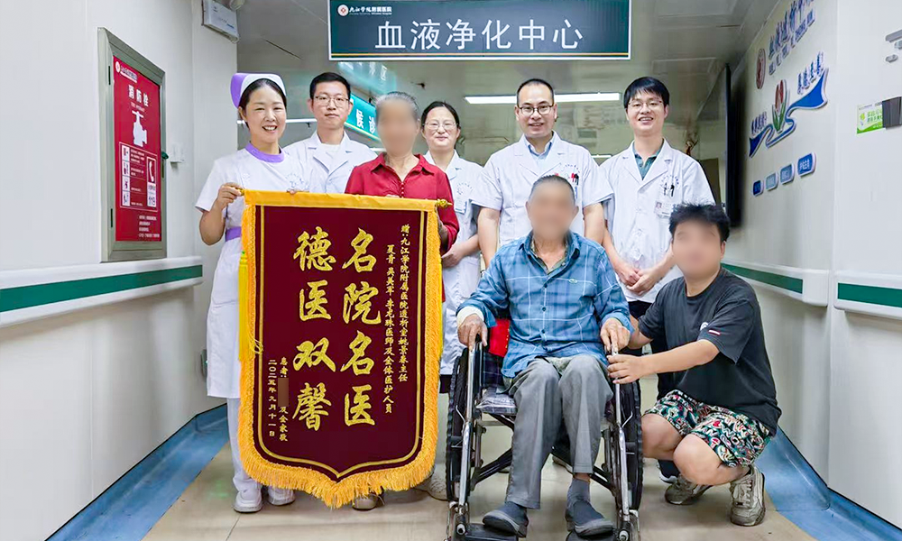 近日,一位尿毒症患者将一面书有“名院名医 德医双馨”字样锦旗送到肾内科,盛赞科室团队以精湛技术保住其手掌,避免截肢。