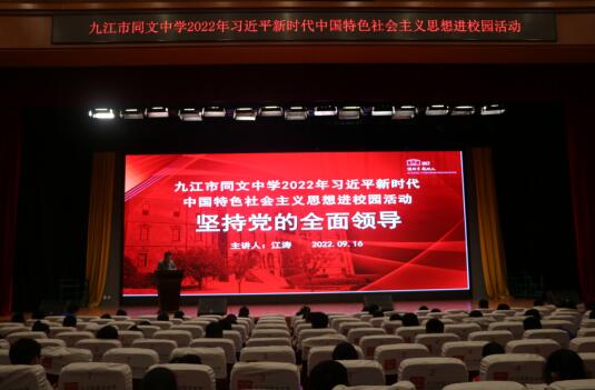 9月16日下午,在政教处的积极组织下,全国文明校园九江市同文中学在博雅馆举办了2022年习近平新时代中国特色社会主义思想进校园活动。活动由政教处副主任黎超群主持。