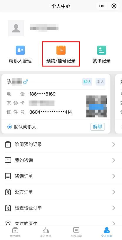 • 进入九江学院附属医院患者端“个人中心” -> “预约/挂号记录”。
