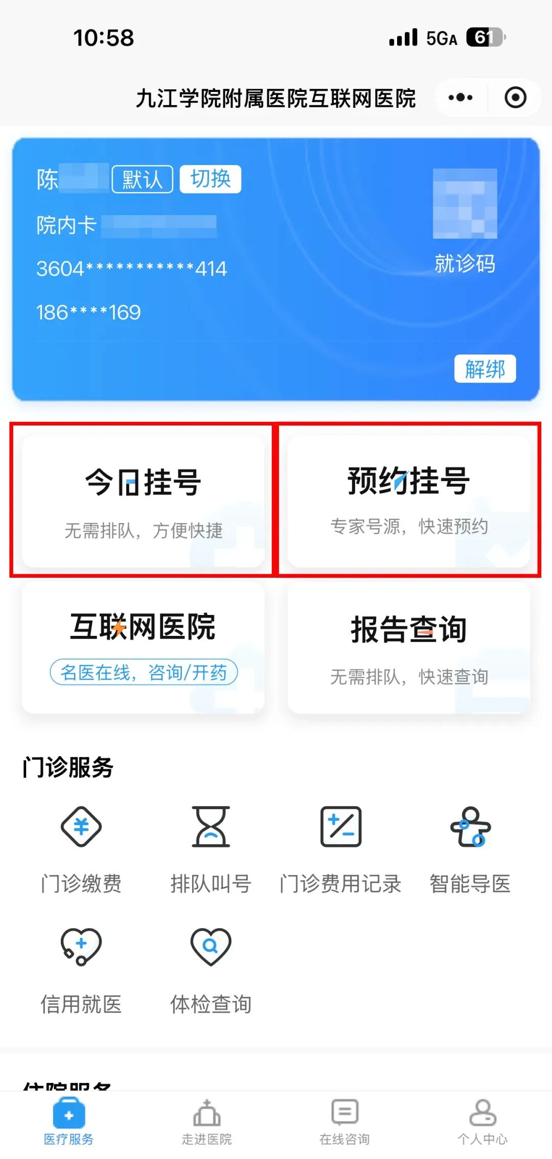 微信界面下拉进入小程序,搜索九江学院附属医院患者端,点击“今日挂号/预约挂号”→ 绑定个人信息→完成挂号和付费。