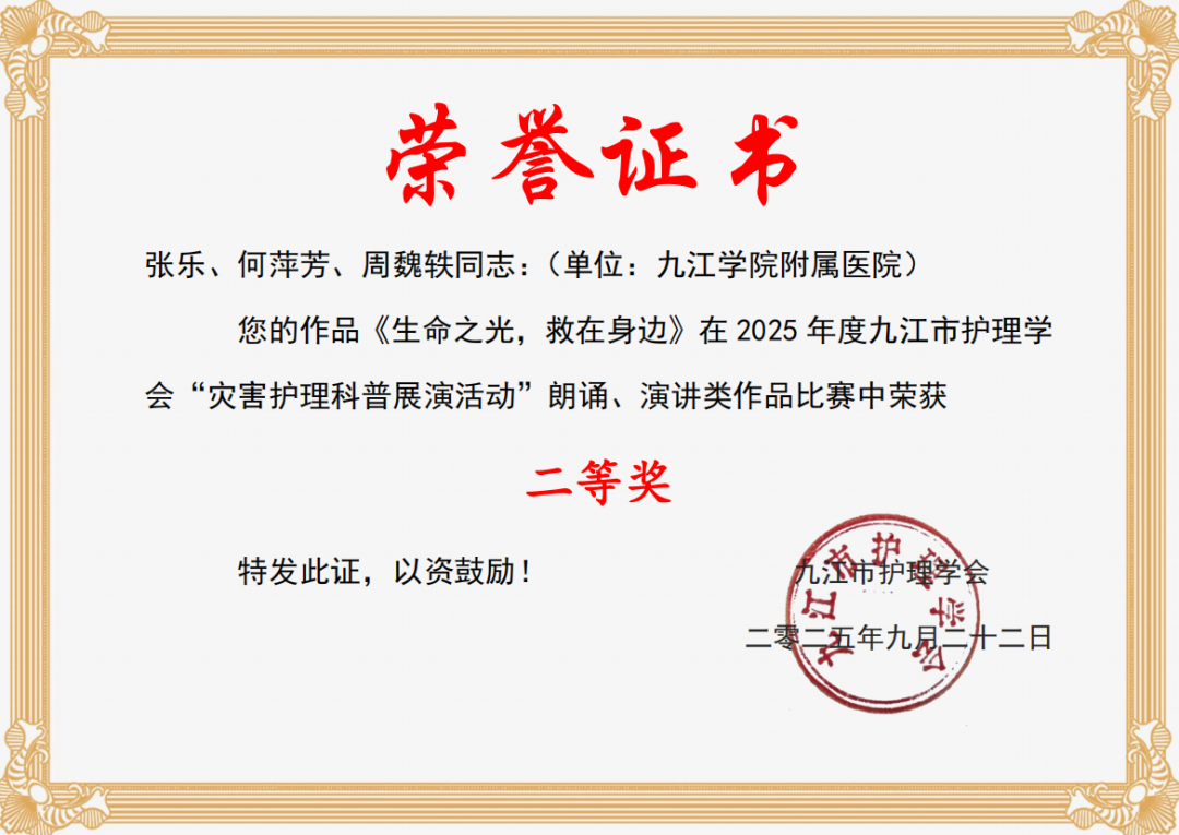 近日,由九江市护理学会主办的“灾害护理科普展演活动”圆满落幕。经过激烈角逐,九江学院附属医院重症医学科护理团队创作并演讲的作品《生命之光,救在身边》在朗诵演讲类比赛中荣获二等奖。