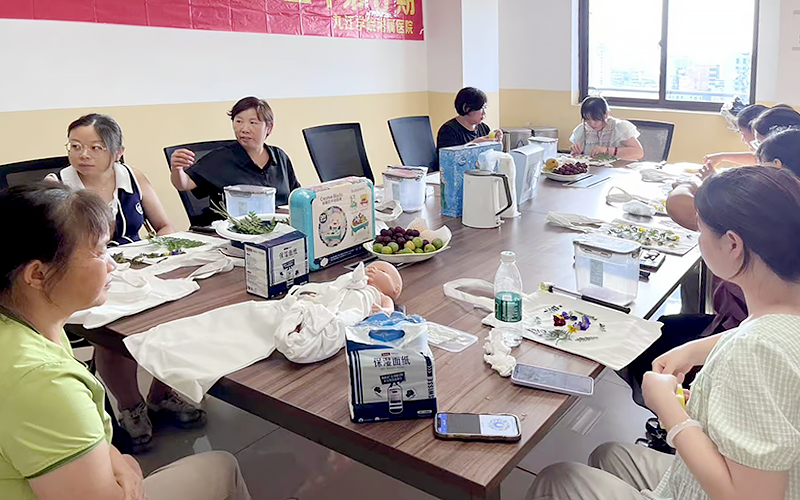 讲座结束后,护理团队特别策划了“植物拓染”创意环节。准父母们用新鲜花瓣和绿叶在棉布上敲拓出自然纹样,制作出独一无二的哺乳巾或婴儿围兜。活动现场欢声不断,准父母们在实践中放松身心,感受自然与育儿的融合。“这片拓染的树叶就像生命的印记,我要用它来包裹宝宝,记录这份期待。”一位准爸爸举起作品,满脸幸福。