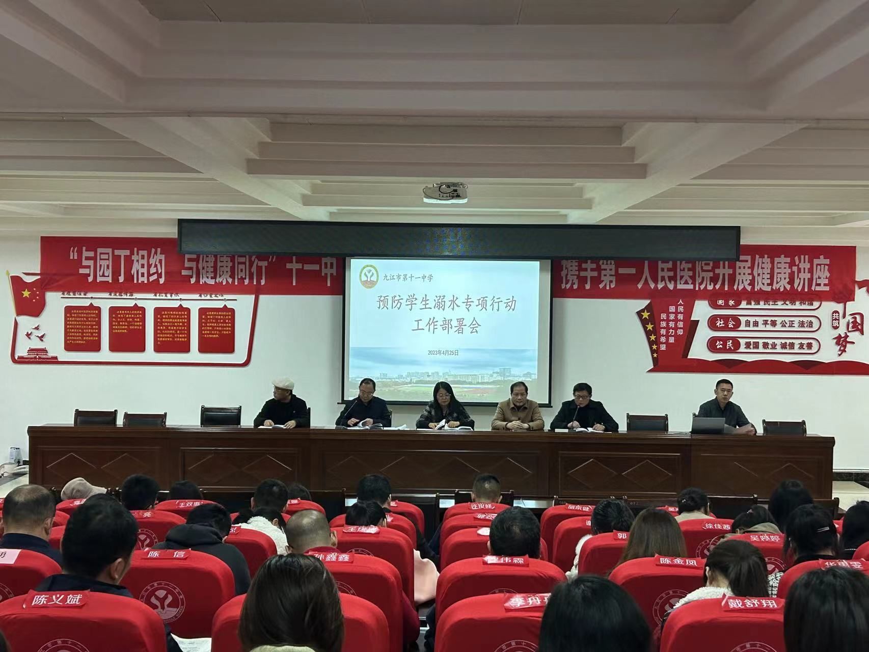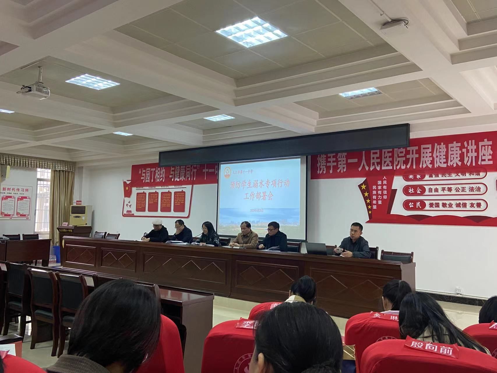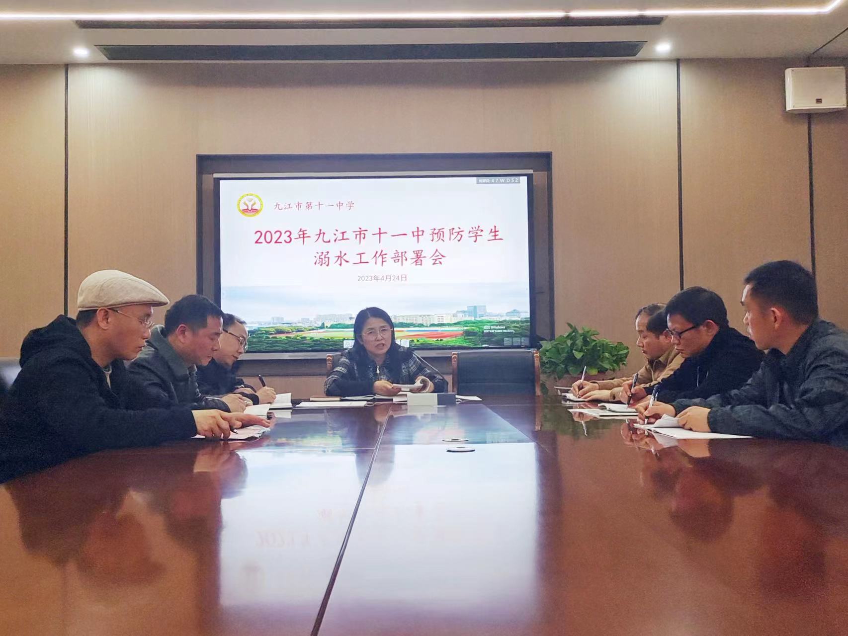 为进一步强化学校安全工作,切实做好学生防溺水安全教育,提高防溺水安全意识,搭建安全防护网,保障学生健康成长,4月24日,九江市第十一中学开展了防溺水工作部署会,校长曹红,副校长余忠庚、徐斌和各处室主任参加了会议。