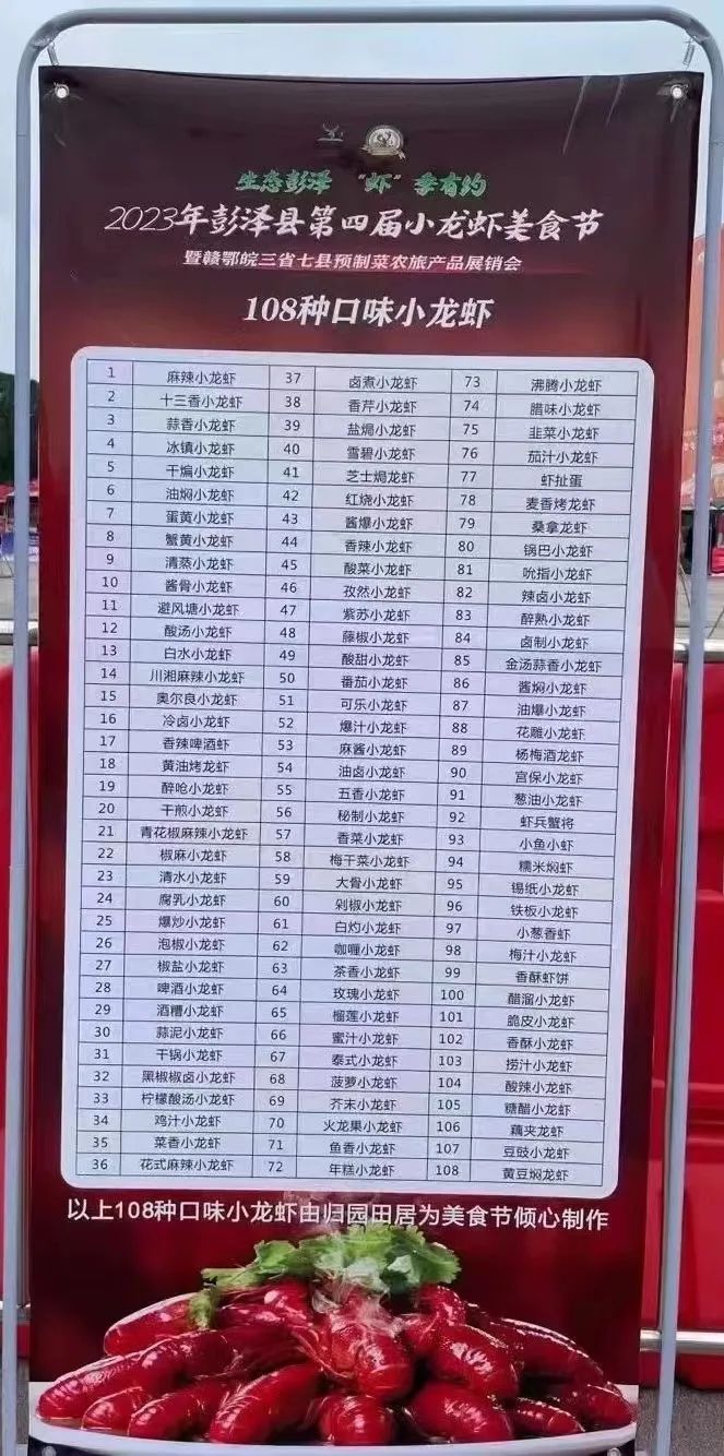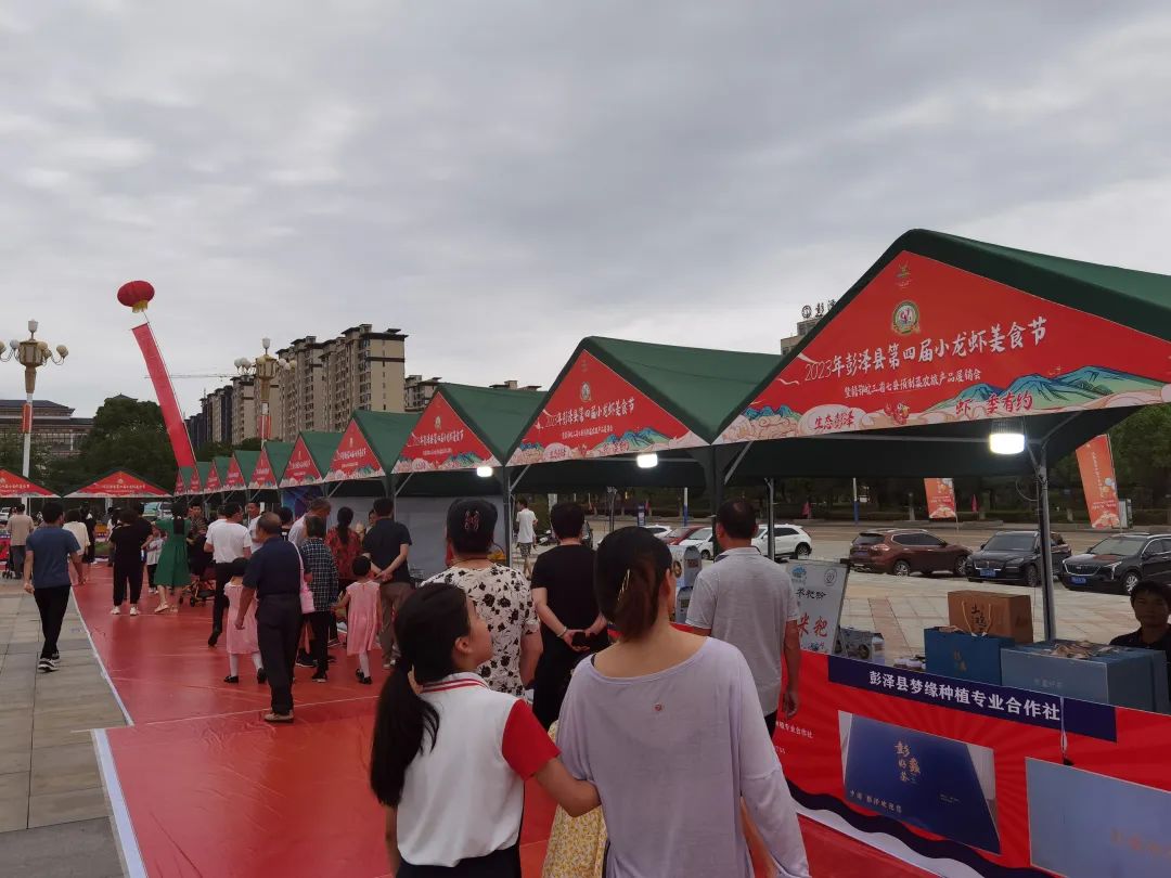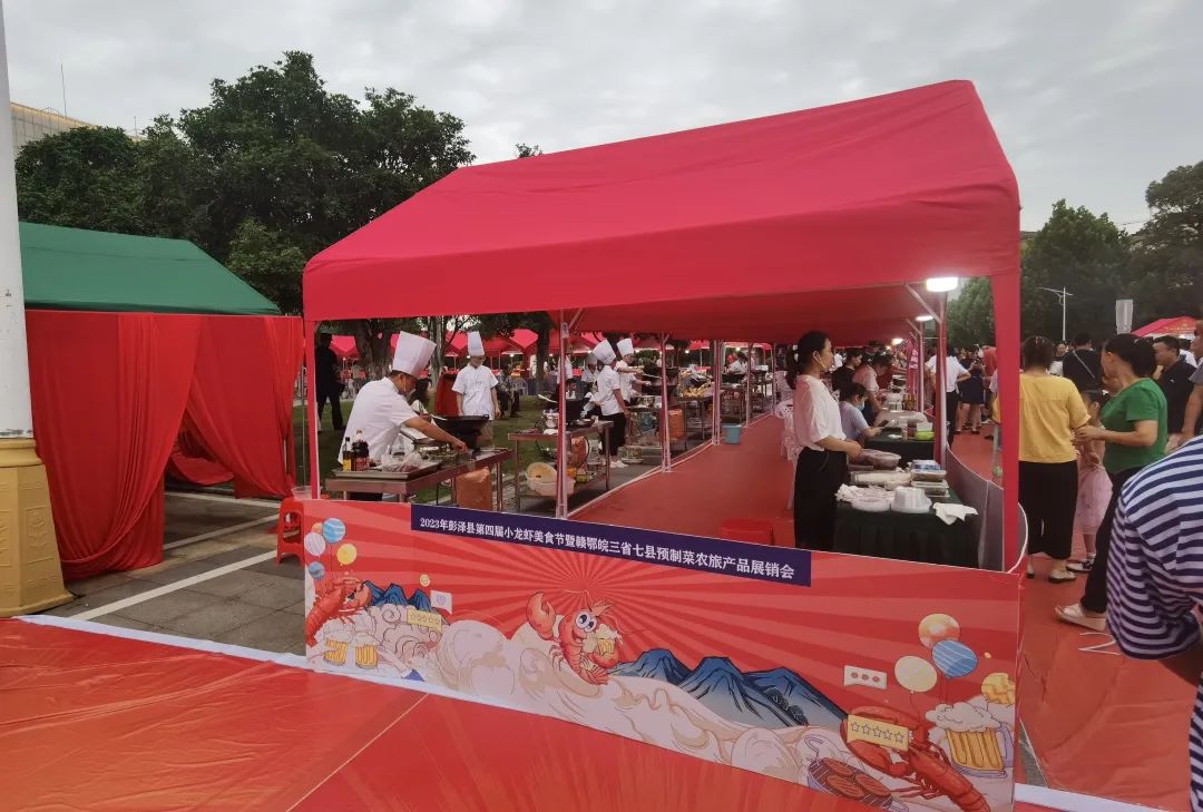 2023年6月19日,彭泽县第四届小龙虾美食节暨赣鄂皖三省七县预制菜农旅展销会活动正式开幕。活动包括开幕式、高峰论坛、项目推介签约会、赣鄂皖三省七县预制菜农旅产品展销会、美食品鉴活动暨小龙虾烹饪大赛、电音节等。