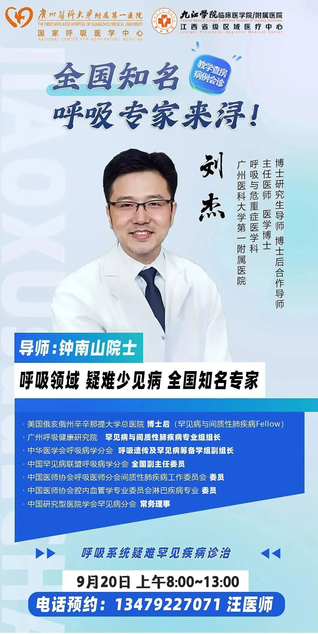 医讯!9月20日,全国知名呼吸专家广州医科大学第一附属医院刘杰博士将来九江学院附属医院查房讲学