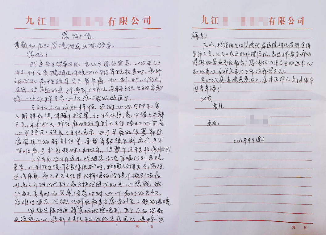 “王主任不仅诊断精准,还耐心与我们解释病情、讲解手术方案,是一位让我至今心怀感激的好医生”。近日,九江学院附属医院消化内科收到一封贲门早癌术后患者送来的感谢信。